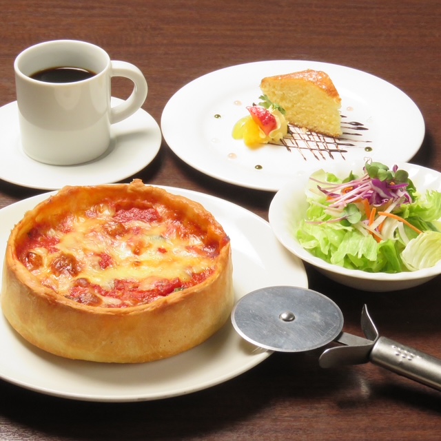 シカゴピザ 事前予約制 単品 Sサイズ (直径 約15cm 高さ 約 4㎝) 約2~3人前 ¥1,800 Mサイズ (直径 約20cm 高さ 約 4㎝) 約3~6人前 ¥ 2,800 (フレッシュトマト、ジャガイモ、ベーコン、ピザソース、チーズ バジル別添え) シカゴピザ セット 事前予約制 お一人様 ¥ 1,650 2名様より (シカゴピザお取り分け ソフトドリンク、ミニサラダ、プチデザート付き) お子さまプレート ¥ 680円(税込) ミニハンバーグ、唐揚げ、ポテトフライ、トマトパスタ、ピザ +100円でソフトドリンク +100円でアイスクリーム 付けられます。